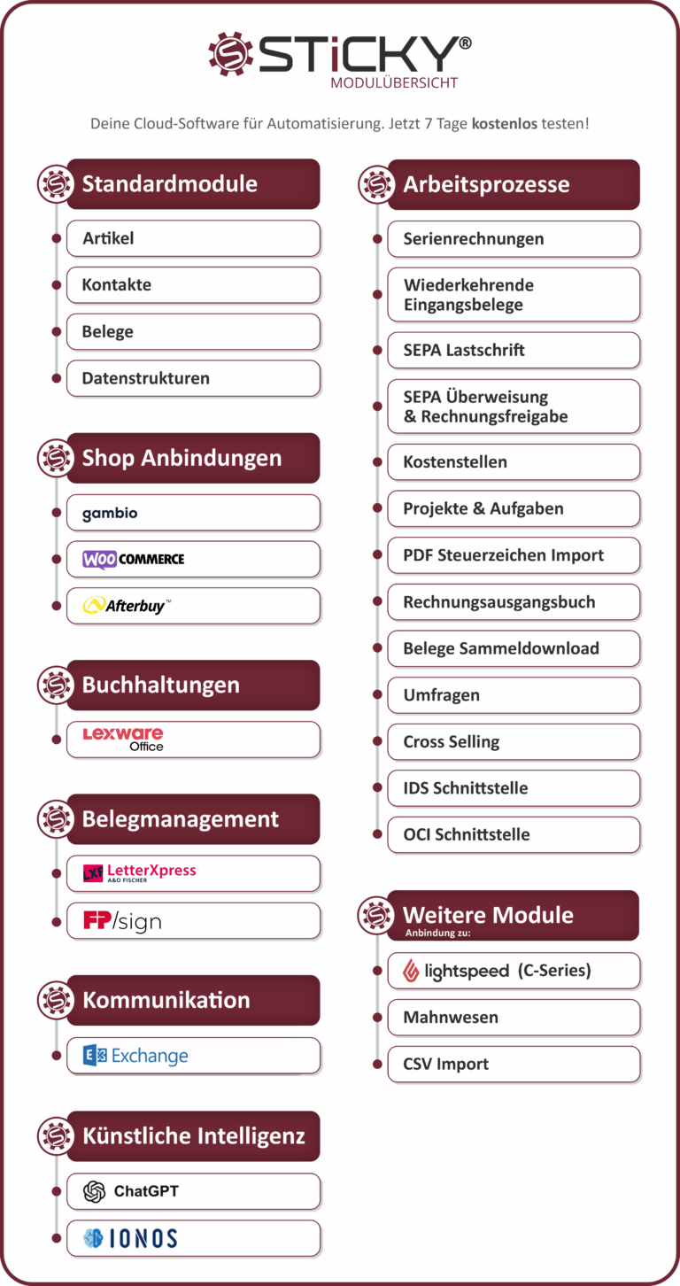 Sticky® ist eine Cloud-Anwendung, um Arbeitsprozesse in allen Bereichen zu automatisieren, tägliche Arbeiten zu vereinfachen und zu zentralisieren. Sticky ist für alle Branchen und Betriebsgrößen geeignet. Das Basissystem besteht aus gängigen Grundbausteinen wie z. B. die Kontakt- oder Artikelverwaltung. Mit Sticky können aber auch ganz individuell eigene Datenstrukturen angelegt werden, sei es für die eigene Fahrzeugflotte oder für die Verwaltung von Immobilien. Je nach Bedarf und internen Abläufen können passende Module für verschiedene Aufgabengebiete, z.B. das Erstellen von Serienrechnungen und das Erfassen von Kostenstellen, gebucht werden.